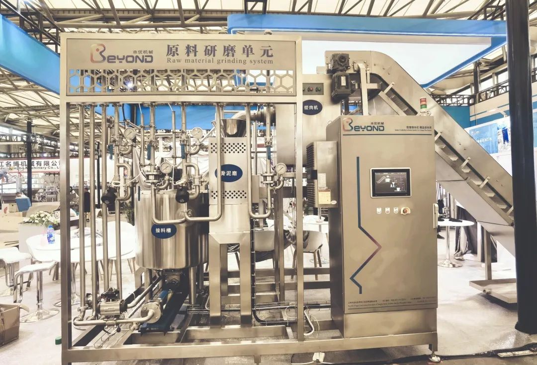 設(shè)備采用破碎絞肉一體機(jī),可以對(duì)-18℃凍肉原料直接破碎絞肉,可以大幅減少?gòu)那袎K或破碎至絞肉機(jī)的傳送過程,有效解決傳送中漏料問題,可以極大的改善傳統(tǒng)陳舊生產(chǎn)線的生產(chǎn)環(huán)境。采用水浴式控溫,為絞肉機(jī)特別設(shè)計(jì)的出料彎頭,可以確保夾肉至骨泥磨出料的順暢。